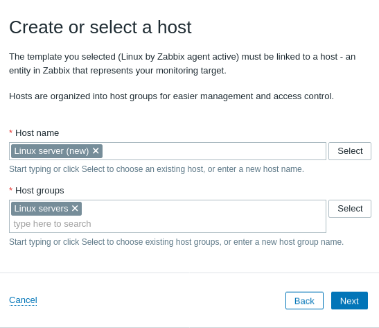 Create a host for the Linux server, add a group for it. This virtual host will contain all data related to the Linux server monitoring.