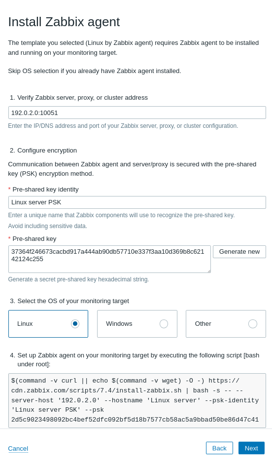 Configure and install the agent. To install the agent, execute the command provided, on the Linux server. It will install the agent, and configure the agent's connection to Zabbix server with encryption.