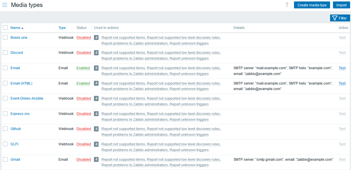 Actions | The following action is available: Test - click to open a testing form where you can enter media type parameters (e.g. a recipient address with test subject and body) and send a test message to verify that the configured media type works. See also: Media type testing. |