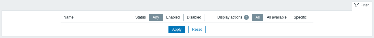 The Filter link is available above the list of media types. If you click on it, a filter becomes available where you can filter media types by name and status. Additionally, you can use the filter to display actions in the Used in actions column based on the scope of their media type usage (defined by the Send to media type parameter in action operation details).