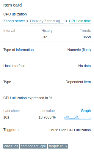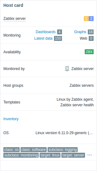 The Host card/Item card widgets display details of a single host/item, allowing you to quickly assess the status and configuration of a host or item (host availability, problems, inventory, item latest data, errors, description, etc.).