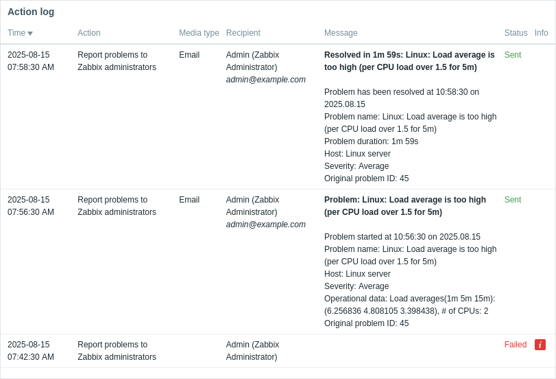 The Action log widget displays details of operations (notifications, remote commands) executed within an action. The detailed log helps with auditing, troubleshooting, and monitoring each action's execution.