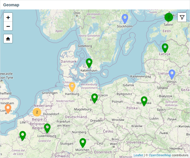 The Geomap widget displays hosts as markers on an interactive Leaflet-based map, with marker colors indicating each host's most severe problem.
