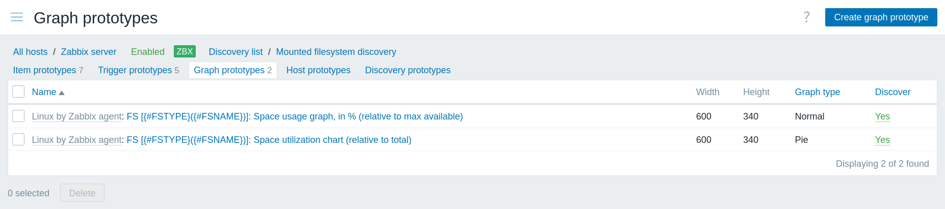 In this section the graph prototypes of a low-level discovery rule on the host are displayed. Graph prototypes are the basis of real host graphs that are created during low-level discovery.