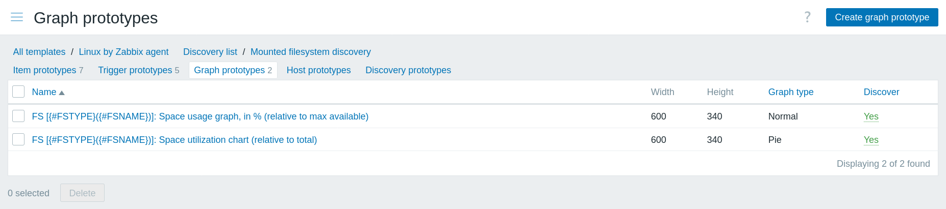 In this section the configured graph prototypes of a low-level discovery rule on the template are displayed.