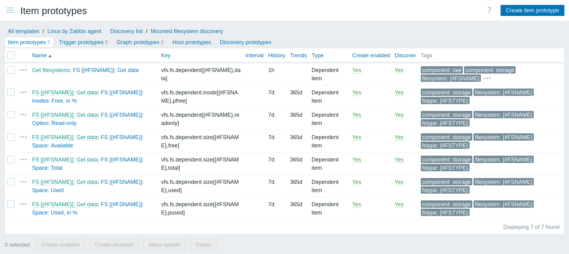 In this section the configured item prototypes of a low-level discovery rule on the template are displayed.