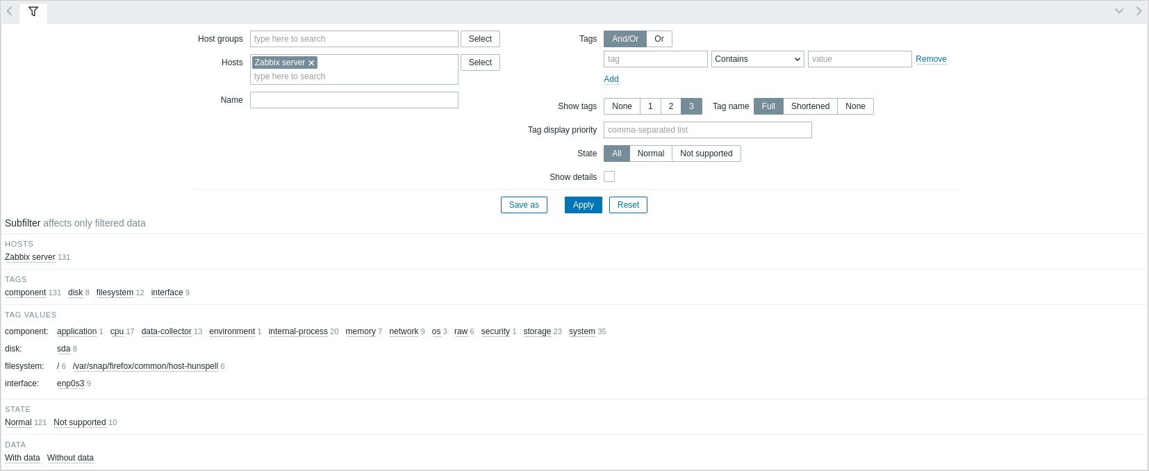 过滤器允许按主机组、主机、监控项名称、标记和其他设置缩小列表范围。在过滤器中指定父主机组将隐式选择所有嵌套主机组。有关按标记筛选的详细信息,请参阅监测 -> 问题。