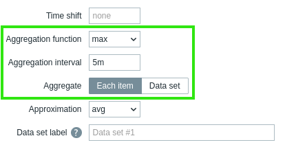 In the following example, the "max" aggregation function is applied to the item with an aggregation interval of five minutes:
