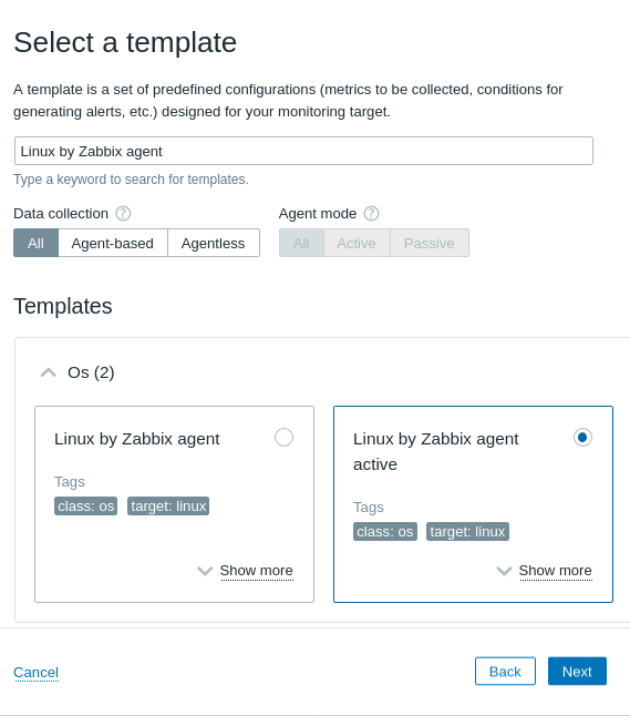Create a host for the Linux server, add a group for it. This virtual host will contain all data related to the Linux server monitoring.