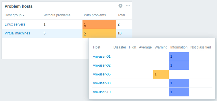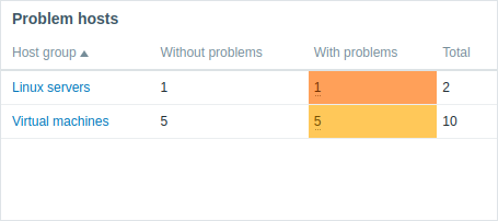 The Problem hosts widget displays the number of cause problems per host group and shows the highest problem severity in each group. It allows filtering problems by different parameters (host groups, hosts, problem names, etc.).