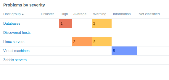 The Problems by severity widget displays the number of cause problems grouped by severity. It allows filtering problems by different parameters (host groups, hosts, problem names, etc.).