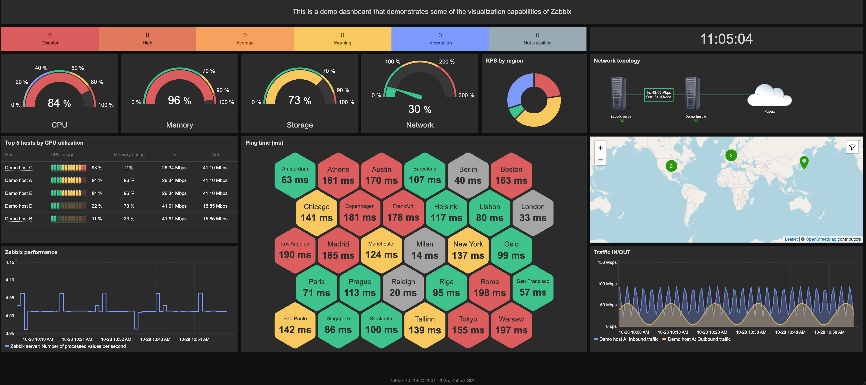 To ensure dashboards look good in both dark and light themes, use the default trigger severity colors (required for Zabbix official templates). You can freely combine these colors in any widgets, including those not related to trigger severities. These colors can be applied to Gauge, Pie chart, Graph, and any other widget that supports color customization.