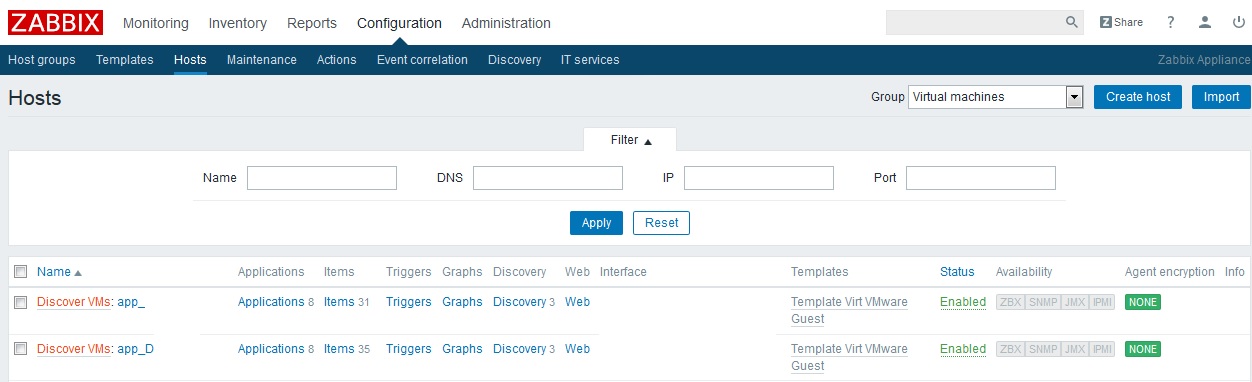 Zum Thema, ich habe mir eine Zabbix Appliance Version 3.2.3 aufgebaut und lasse ESX Hosts damit Monitoren über die Zabbix internen Templates "Template Virt VMware". Dabei werden meine VMs als "Discover ... Hostname" unter den Hosts mit Filter auf "Virtual Maschines" angezeigt. Soweit so gut.