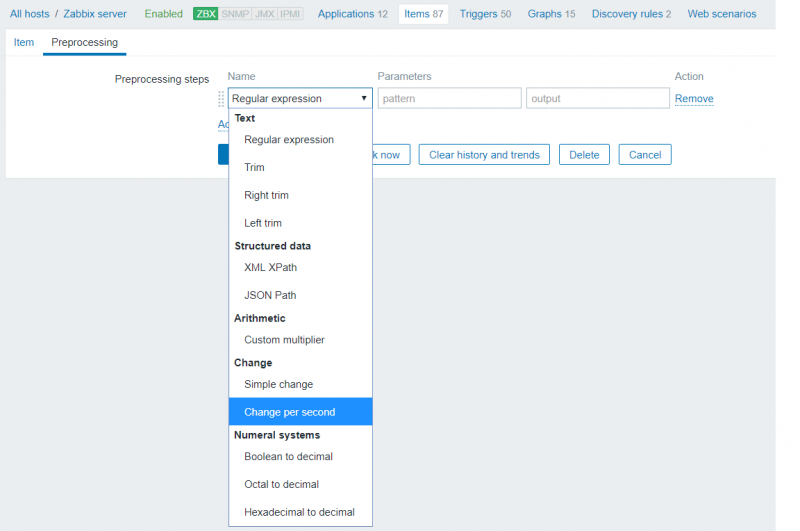 Opa, agora a configuração de 'pre-processamento' está separada. Escolhe a opção 'Mudança por Segundo'. O Tráfego de rede é um contador que só incrementa até 'estourar' o tamanho do campo ... depois volta pra zero. No caso do tráfego de rede: usa essqa configuração que resolve.