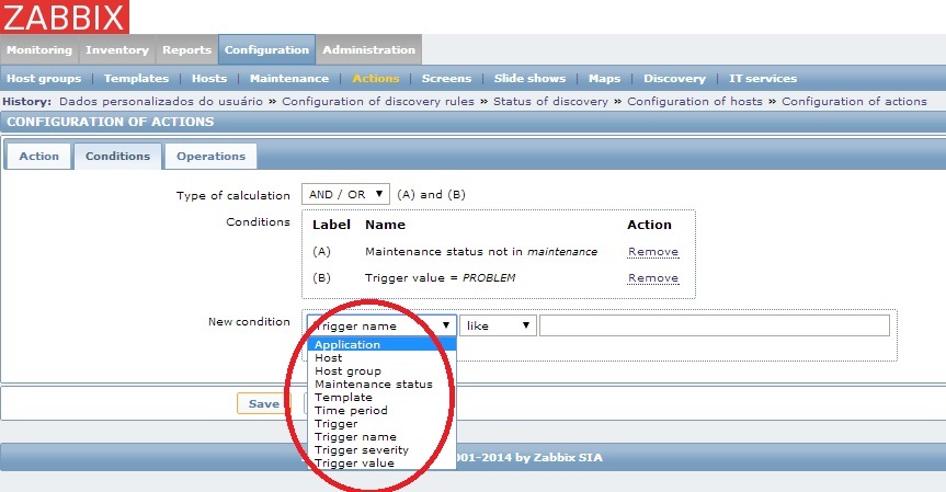 No momento que vou criar a condição (Configuration>Action>Condition), no campo New condition, devo add "Reseived value like Windows", porém na minha lista não consta essa opção. Somente aparece as opções conforme figura anexo, não constam as opções "Received value", "Uptime/Downtime", "Discovery status" nem "Service type".