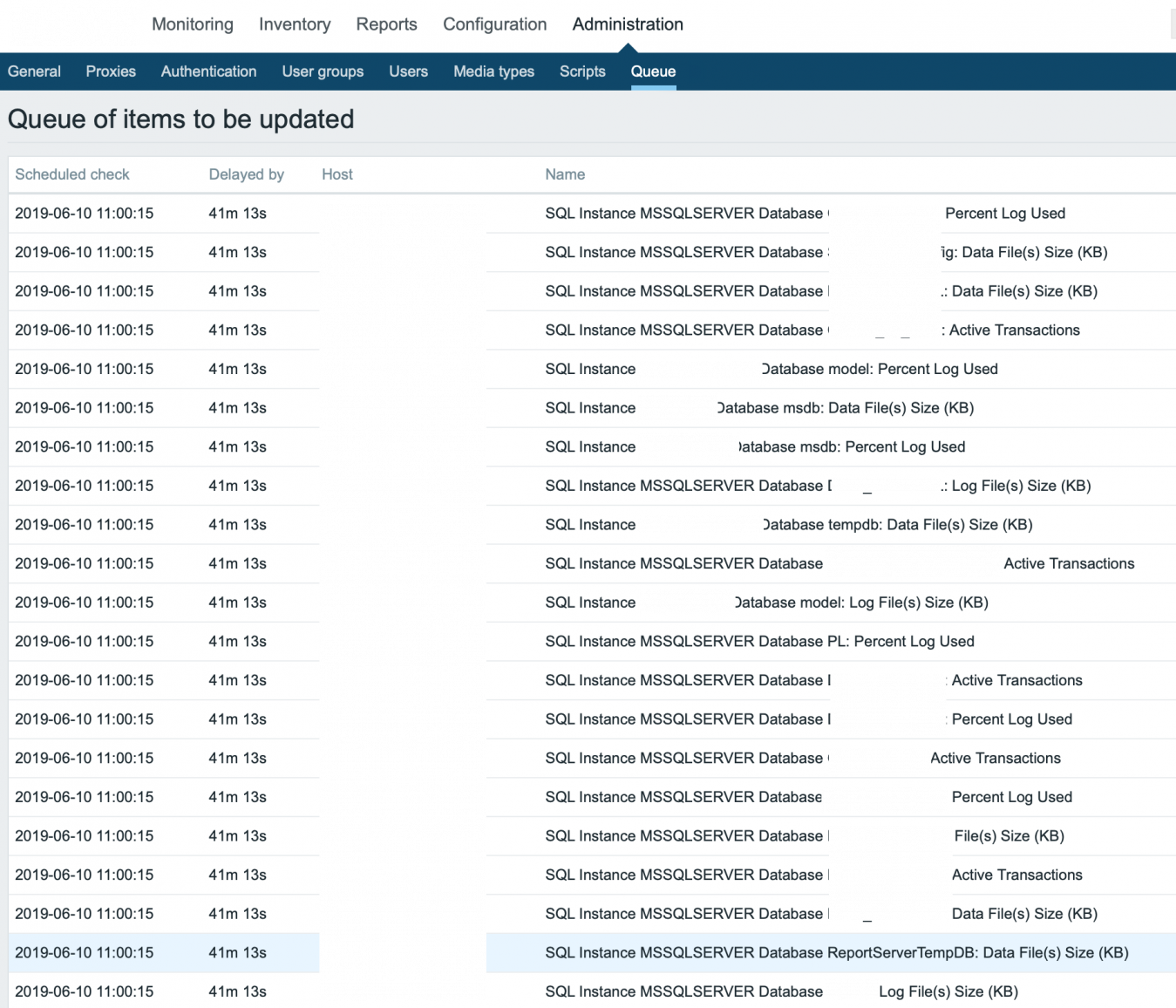 La plantilla hace LLD para bases de datos, trabajos, etc. El tema es que, por cada item descubierto (por ejemplo, base de datos), se lanza un PowerShell que interroga por el estado de la base de datos descubierta. Esto está genial, pero lo que vemos es que si tenemos 20 bases de datos, el check de comprobación del estado de la base de datos, el agente lanza un PowerShell interrogando por el estado de la base de datos A, y cuando SQL Server le retorna el estado de la base de datos A, lanza otro PowerShell interrogando por el estado de la base de datos B, y así por todas las bases de datos, pero lo hace uno a uno, no lanza, en el ejemplo, 20 PowerShells interrogando por el estado de todas las bases de datos. Y eso se traduce a n mensajes en la cola pendiente de datos: