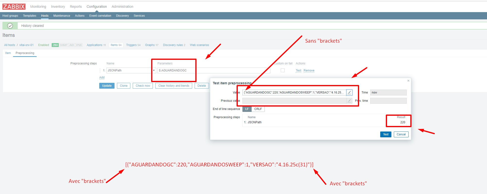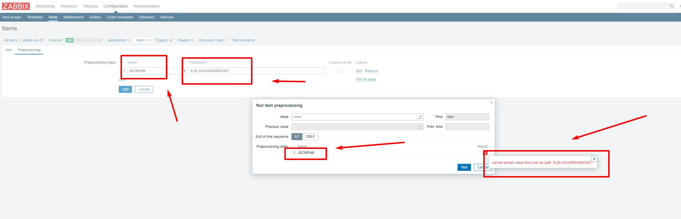 Estou fazendo alguns testes de forma que o zabbix possa consumir alguma api que retorna os valores em formato Json . Ja fiz varios testes , segui os tutoriais , instalei o zabix compilado com o Curl e até instalei a versão 4.4 Alpha . Mas nada funciona , devo estar perdendo algum detalhe .