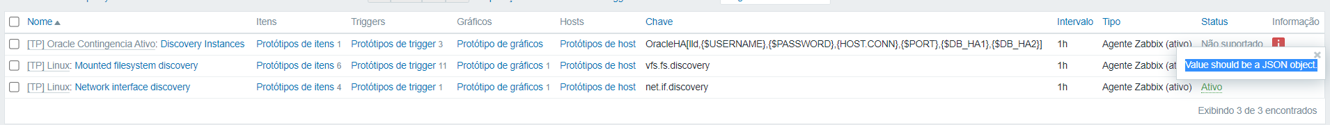 Tenho um monitoramento de um host linux de um banco de dados oracle. Já tenho ele em outros host mas não fui eu que fiz a ação então tentei fazer os mesmos passos que foi feito anteriormente mas ele fica apresentando a mensagem " Value should be a JSON object.". Segue abaixo o agente e o script que estou executando... se alguém souber de uma solução:
