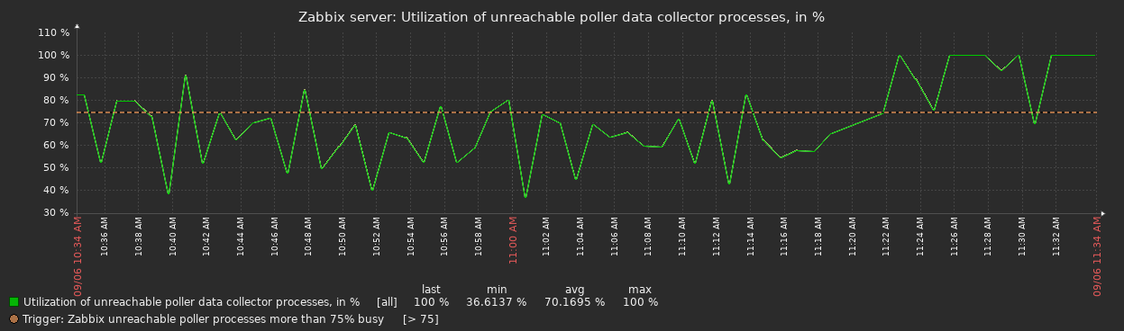 Zabbix server: Utilization of unreachable poller data collector processes, in %