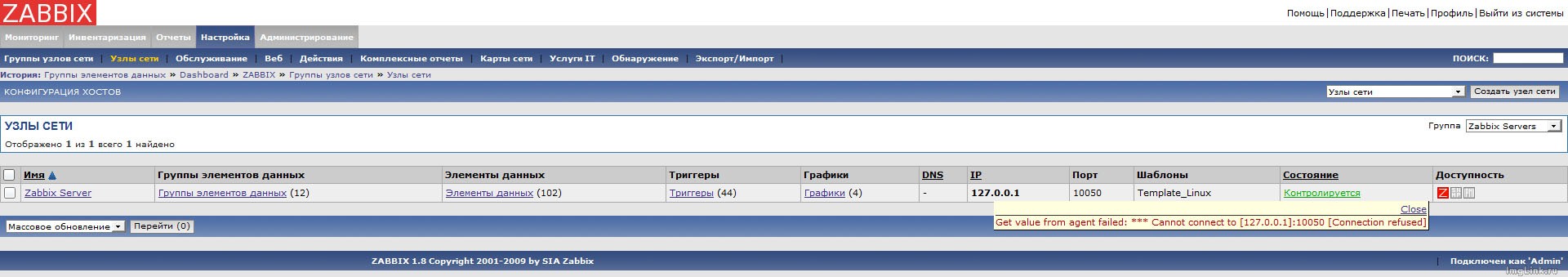 На второй картинке как видно: доступность Get value from agent failed: *** Cannot connect to [127.0.0.1]:10050 [Connection refused]