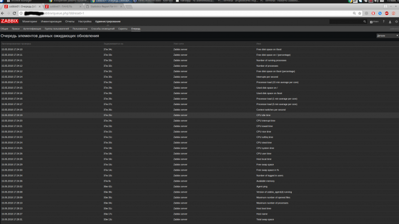 Фронтенд работает крайне медленно. Раздел Мониторинг->Графики /Триггеры открывается по 15-20 минут. Очередь элементов данных выглядит как на картинке.