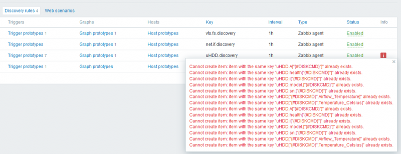 Установил шаблон для мониторинга SMART https://github.com/v-zhuravlev/zbx-smartctl на два хоста. На одном всё работает, а на другом Cannot create item: item with the same key на каждом item.
