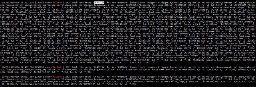 В логах заббикс жалуется на дублирование записи с id 26493154. Пытается я так понял записать туда изменения статуса триггера. Триггеры пытается записать каждый раз разные.