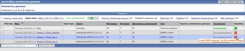 Создаю еще один точно такой же "элемент данных", но уже с ключом "enterprises.40418.2.3.4.2.2" и OID ".1.3.6.1.4.1.40418.2.3.4.2.2" для получения данных с вынесенного датчика, в результате чего zabbix сообщает состояние элемента "Не поддерживается" и пишет ошибку "Invalid SNMP response: variable bindings out of order". В этот же момент перестает работать первый элемент данных, точно с такой же ошибкой.