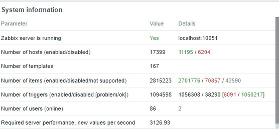 CentOS 8, Zabbix 5.0.12, PostgreSQL. На одной ВМ установлены и сервер, и бд. Порядка 16000 сетевых элементов добавлено для мониторинга.