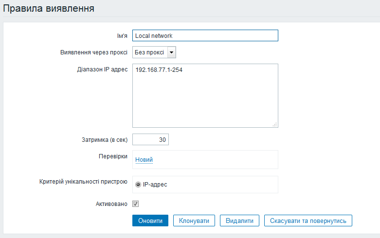 Если зайти в Configuration > Discovery > Discovery rules и редактировать правило, то на английском всьо хорошо. Если же переключить на украинський, то не отображаеться тип проверки и кнопка "Новий" недоступна:
