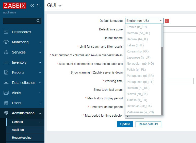 В zabbix appliance \Administration\General\Default language – немає UA.