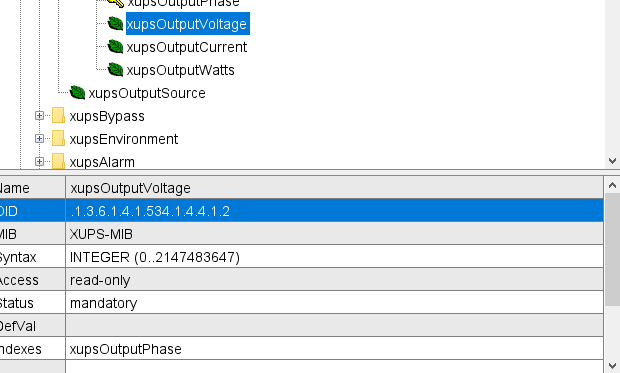 "1.3.6.1.4.1.935.1.1.1.3.2.1.0 что пишет?" SNMP error: (noSuchName) There is no such variable name in this MIB.Все дерево я и так до этого смотрел, там не понятно что отвечает за Input Voltage. Мониторю если что через приложение MIB Browser,там все тоже самое. Коэффициент обычно 0.1 пробовал ничего не меняется значение все равно гигантское.