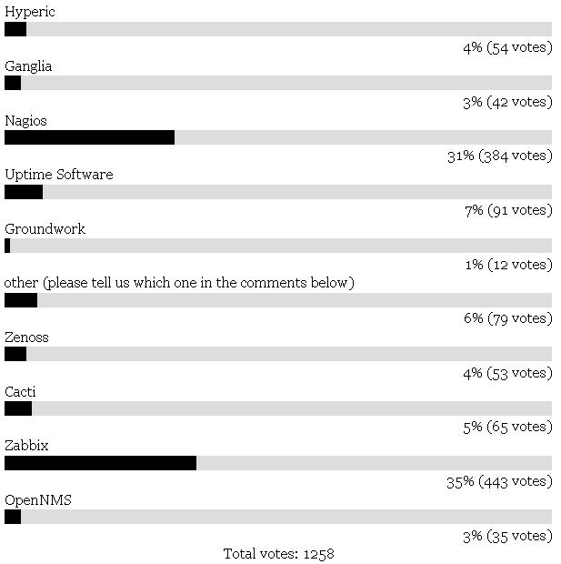 Got to http://www.linuxjournal.com/node/1010972 and vote for your favorite monitoring application. Zabbix is on the list