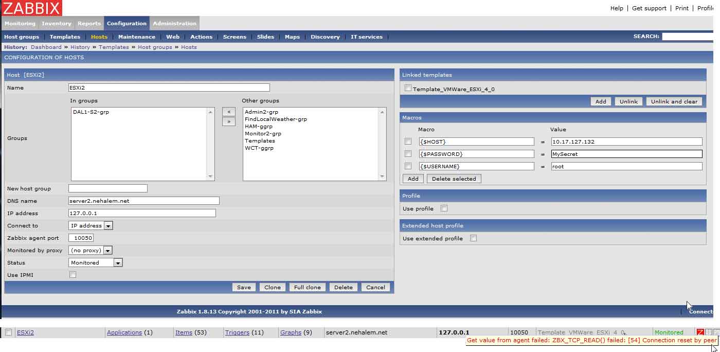 1. I've uploaded a single image that shows the host setup, and the host browse with the ZBX_TCP_READ () failed (54) connection reset by peer. The only data it brings in is icmpping, and that is always successful