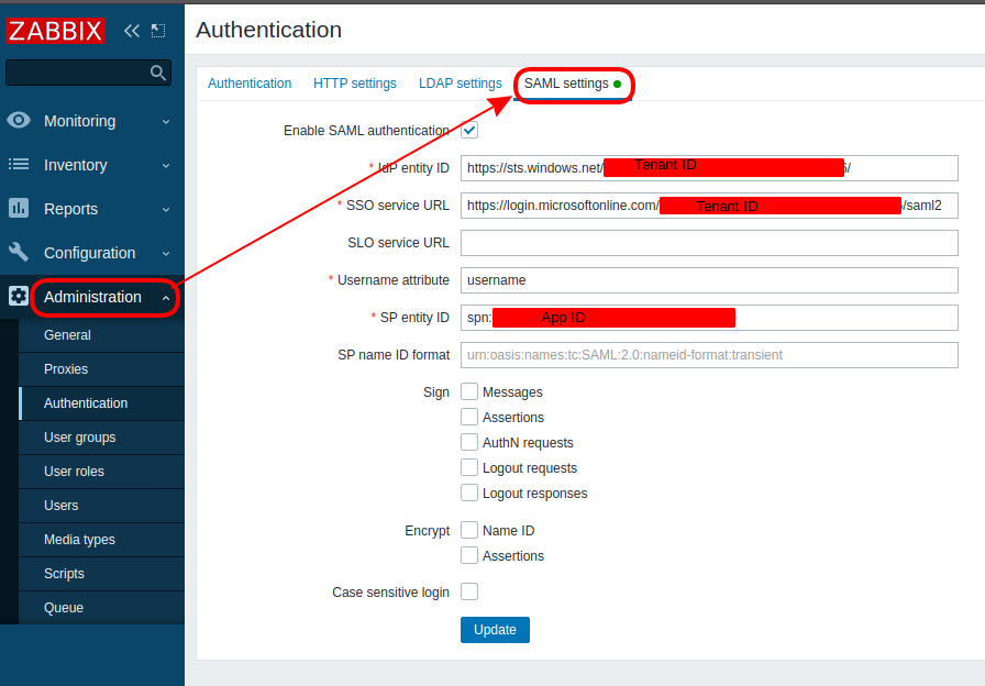Now head in to the Zabbix Administration section and click on the “SAML settings” tab. Enter the information as in the screenshot. The App ID can be found on the Properties page in the Azure AD App.