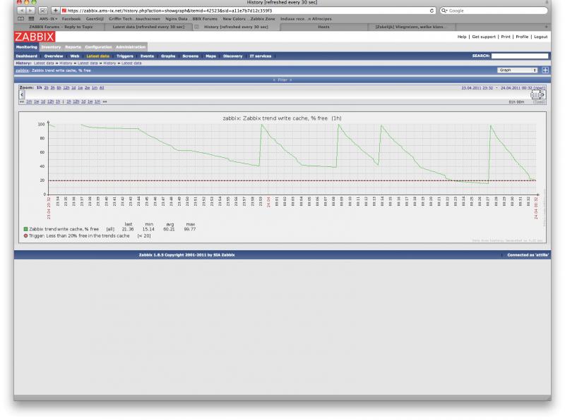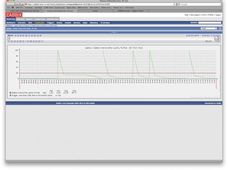 I disabled half of my large hosts and you see that it kept running now, but since I saw the available trend cache drop I increased the limit again from 128M to 1G, but as you can see, it doesn't matter. So I enabled some extra hosts and you see that it drops towards zero, resulting in the crash again.