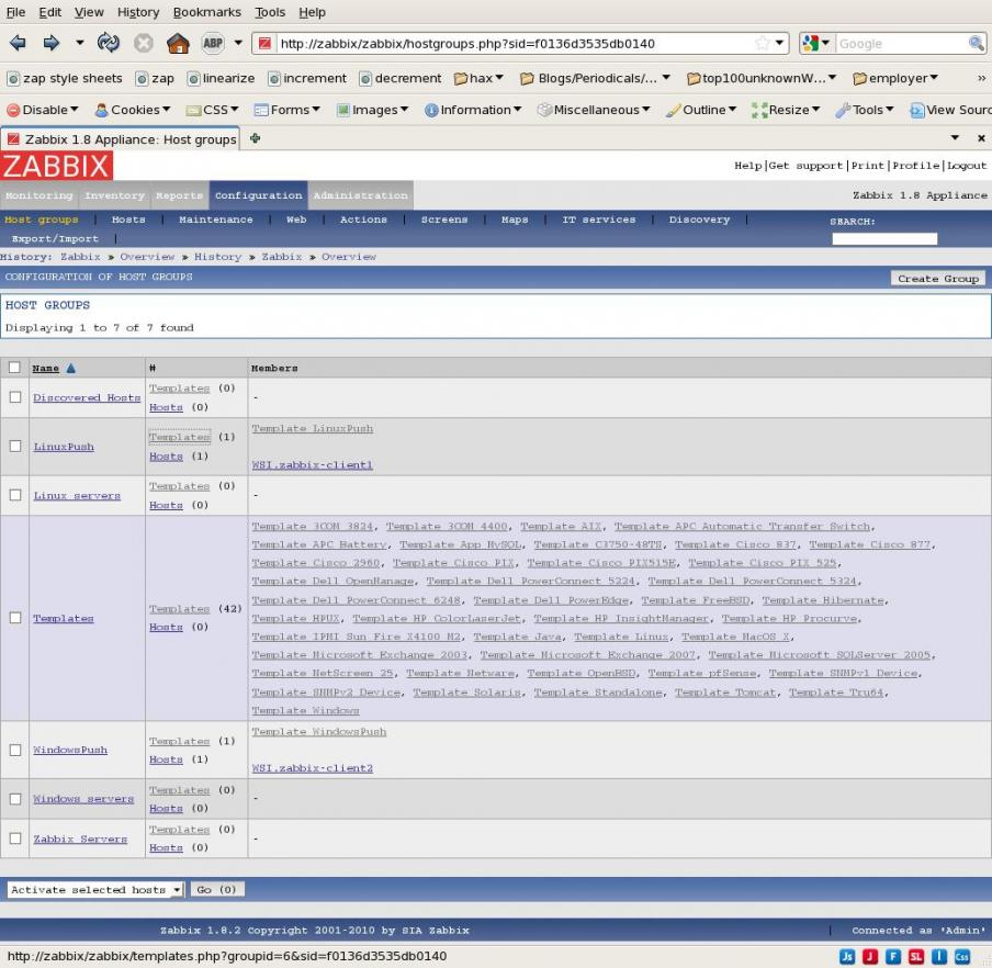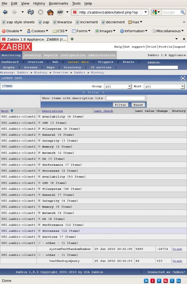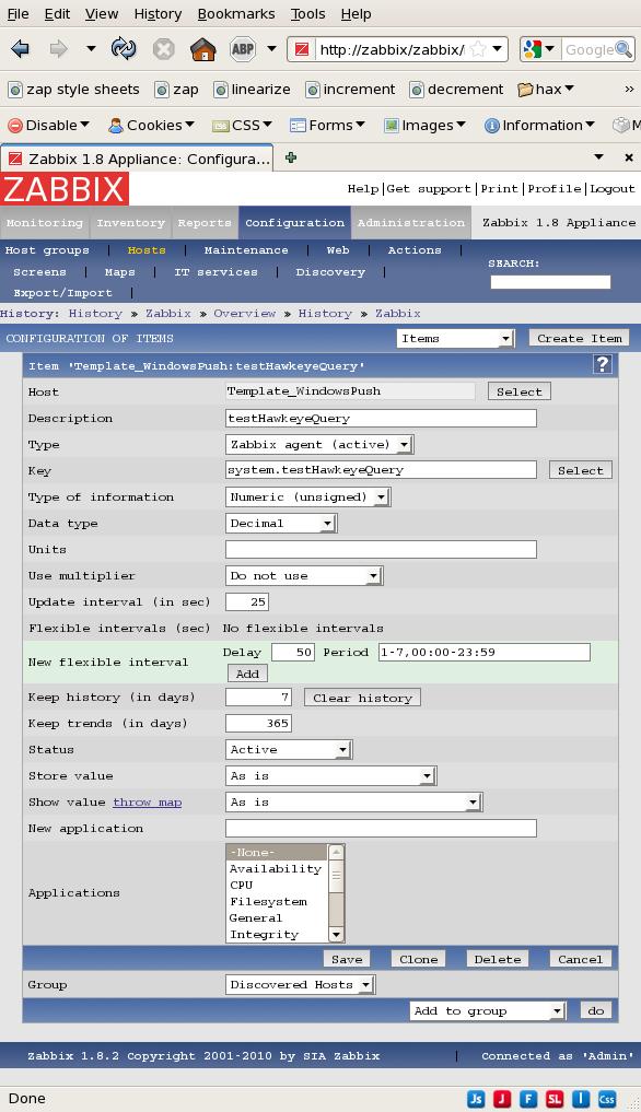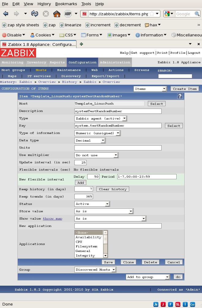 BACKGROUND: (probably irrelevant) I'm working with two agents (one Linux, one Windows) on systems that are behind firewalls so the server cannot initiate *any* contact - only the agents can initiate contact. I have configured the Linux agent to generate a trivial report by spawning a shell instance that echoes a random number (using bash) and I have configured the Windows agent to do approximately the same thing using VBscript. As these agents are entirely responsible for pushing all info back to the server I created two new Templates (LinuxPush and WindowsPush) that are clones of the respective Templates that come standard with Zabbix, except that all Items are marked Active. Then I added one new Item to each Template to receive the random numbers now being offered by the clients and left those new Items marked as "Other" ie. I did not assign the new Items to any Application. Each of the new Templates was moved to its own new group created for the occasion.