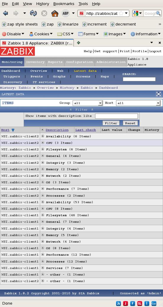 ...however, I notice that when I open the screen at Monitoring->LatestData I see the "other" entries for the two clients in the default collapsed state, but if I click the '+' sign to expand just one of the ' - other' entries then both are expanded simultaneously. I'd say that's a bug, though not a showstopper.