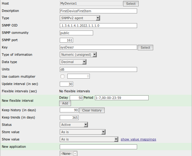 While creating a host, I set the Zabbix Agent Port entry to 161. I created an item with the OID that I need to query and activated it. I created a graph for the item to check for the trend of the item.