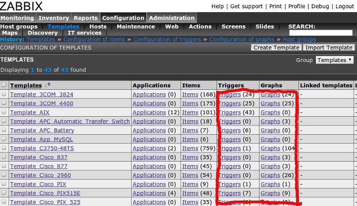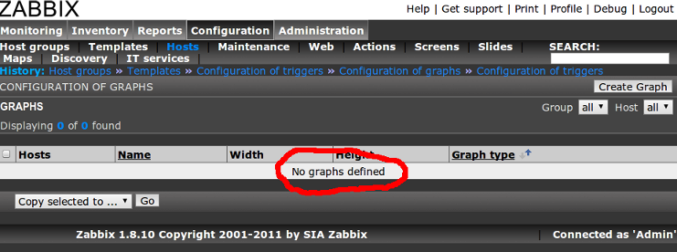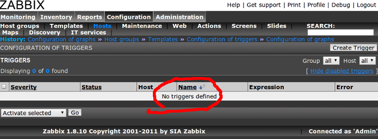 "No triggers defined" or "No graphs defined" message , can't see any error message in debug mode or httpd error log.