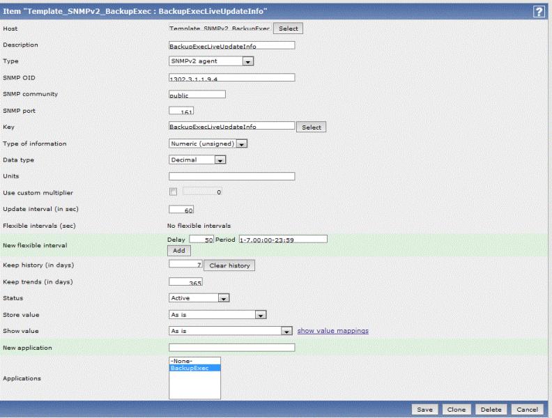 I have created a clone of the built in template Template_SNMPv2 which I am working from. I have created a Item named 'BackupExecLiveUpdateInfo' (as Im basing my testing on the Live Update function), and have obtained the OID 1302.3.1.5.6.1.3 from within BE help file. I have created the Item as per the image I have attached to this post.