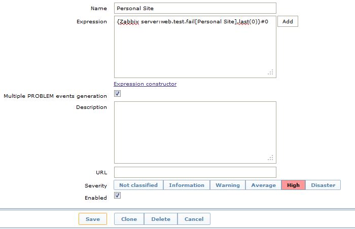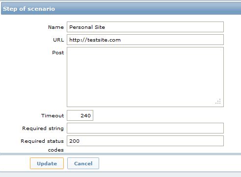 Currently we configured scenario and then trigger as {Zabbix server:web.test.fail[Personal Site].last(0)}#0 .