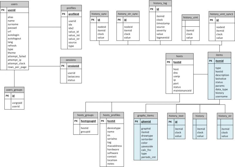 For this purpose, I'm trying to build a data conceptual model from the DB structure file (I think there already are some tools which are able to do the job) and I am trying to gather any information about the Zabbix DB.