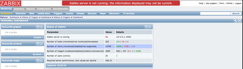 I have a zabbix server which was working without problem almost a year, till monday. Since monday I am having problems. Zabbix server stops working after a while. I got the error "Zabix server is not running:the information displayed may not be current." I tried to open debug log level 4, but it did not give any useful information. When I restart mysql and zabbix server, it works fine for a while (anout an hour) but after that the same situation occurs, what may be the problem?