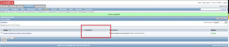 I'm relevantly new to Zabbix, I experience some weird issue. I have defined all my hosts, I can see that the hosts being monitored by Zabbix server, however when I'm trying to define the "conditions" for example "trigger severity" = "High" it says that the condition "has updated" but actually it doesn't save any "conditions" please see screenshot below:
