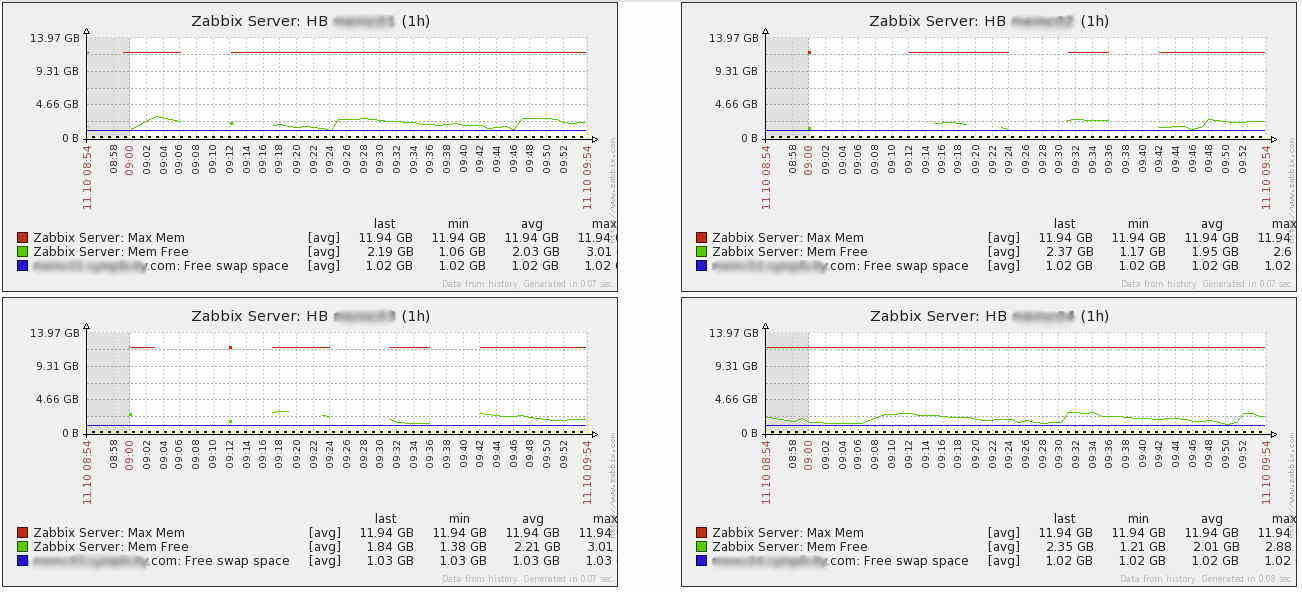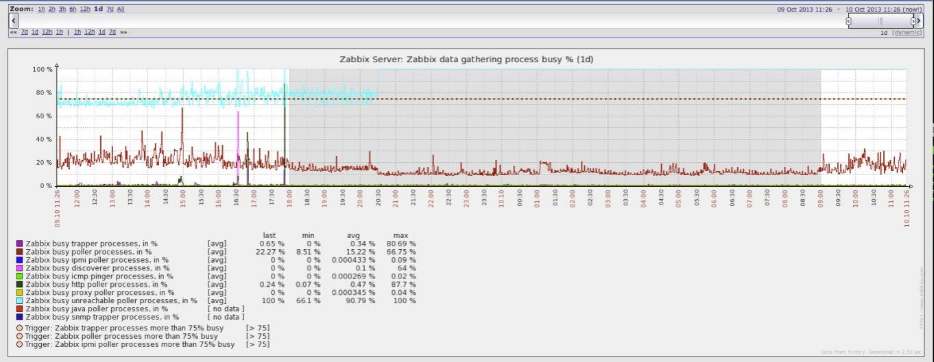 Thanks, things seem to be better now that I changed the swappiness on the server to 0 so that it only swaps as a last resort and applied the configuration tweaks you suggested. However one problem still remains, if you look at my attached screenshot you'll see that some graphs are randomly getting breaks in them. The graphs are using data obtained from scripts the server is set to run as items and the scripts should be fine. The graphs weren't a issue until we finished adding all our servers and monitoring items, now it seems like the server is too busy to maintain a steady stream of the data the graphs depend on? Anything to tweak to make the data come in more reliably? Thanks.Comment
