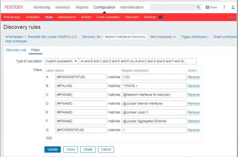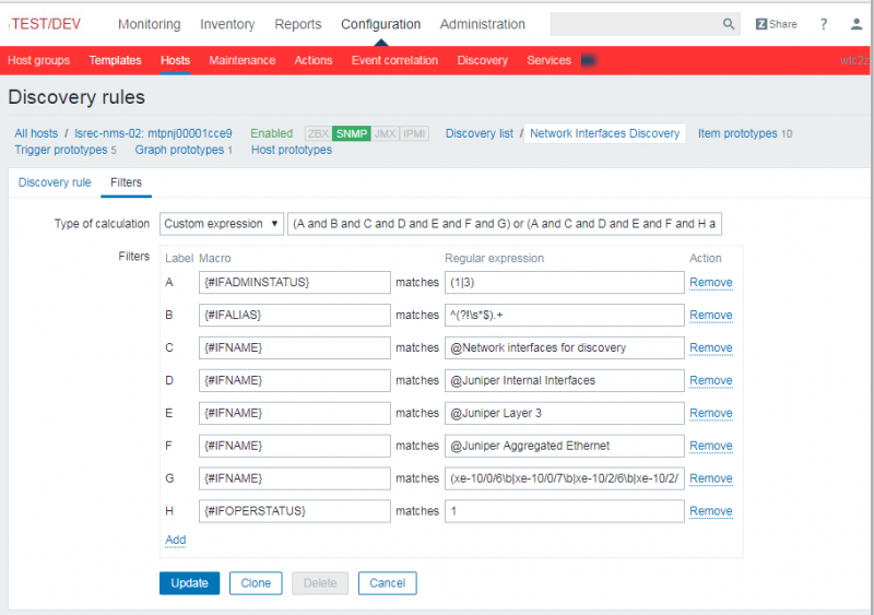 I'm trying to figure out a good way to use custom filters along with discovery rules in a template. I have templates setup to discover network interfaces that have filters in the discovery rule (no internal interfaces, no loopbacks, oper status up, etc.)