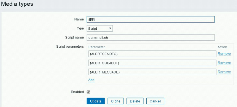 4) I create media type with the type 'script', its name is 'sendmail.sh', its parameters are '{ALERT.SENDTO}','{ALERT.SUBJECT}','{ALERT.MESSAGE }'.