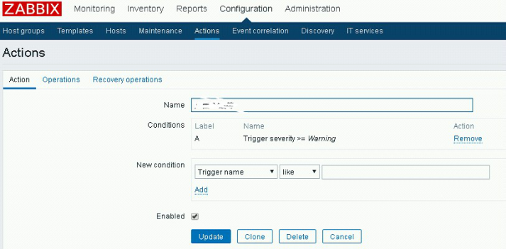 6) edit configuration->actions -> action, condition is 'trigger severity >= warning'