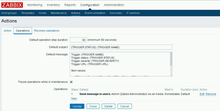 8) edit configuration->actions -> recovery operations: send message to users: Admin (Zabbix Administrator) via all media